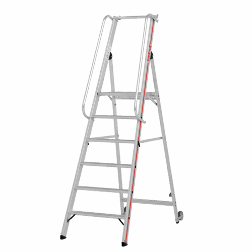 Notre échelle à plate-forme dotée de roulettes et d’une longue main-courante, offrant confort et sécurité pour des travaux de longue durée :