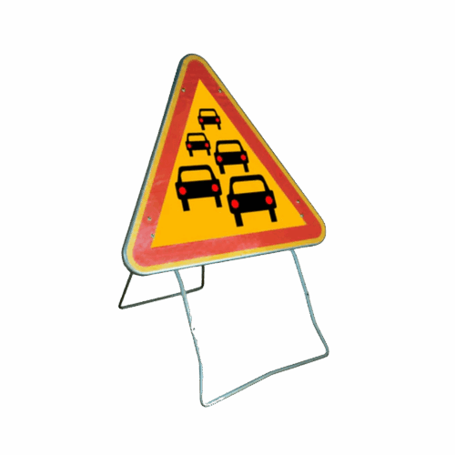 | Coloris | Fond jaune, triangle rouge, pictogramme noir (files de véhicules ou bouchon) |
